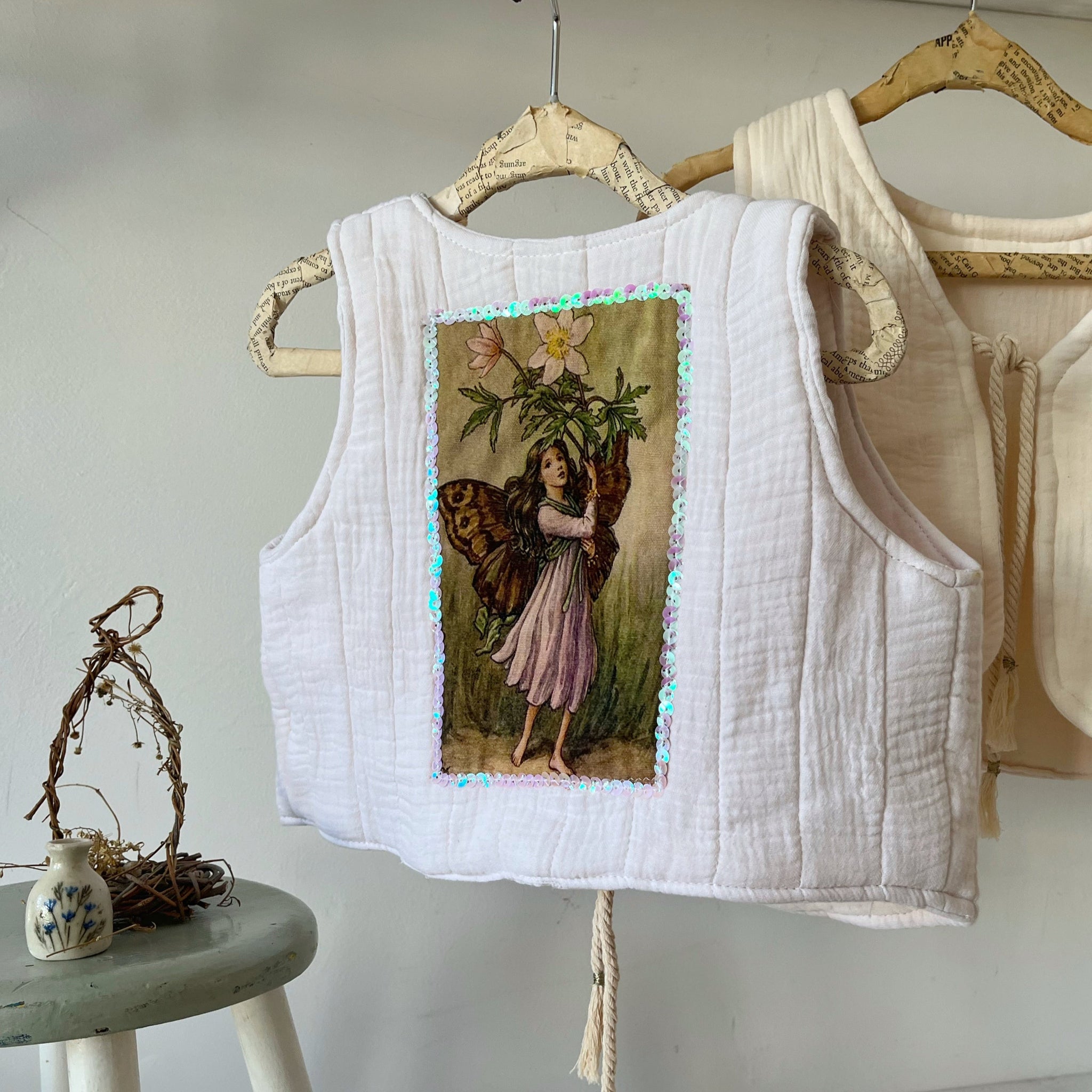 a little celebration of the beautiful flower fairies created by Cicely Mary Barker , soft cotton quilted vest a great layering piece for spring/summer.