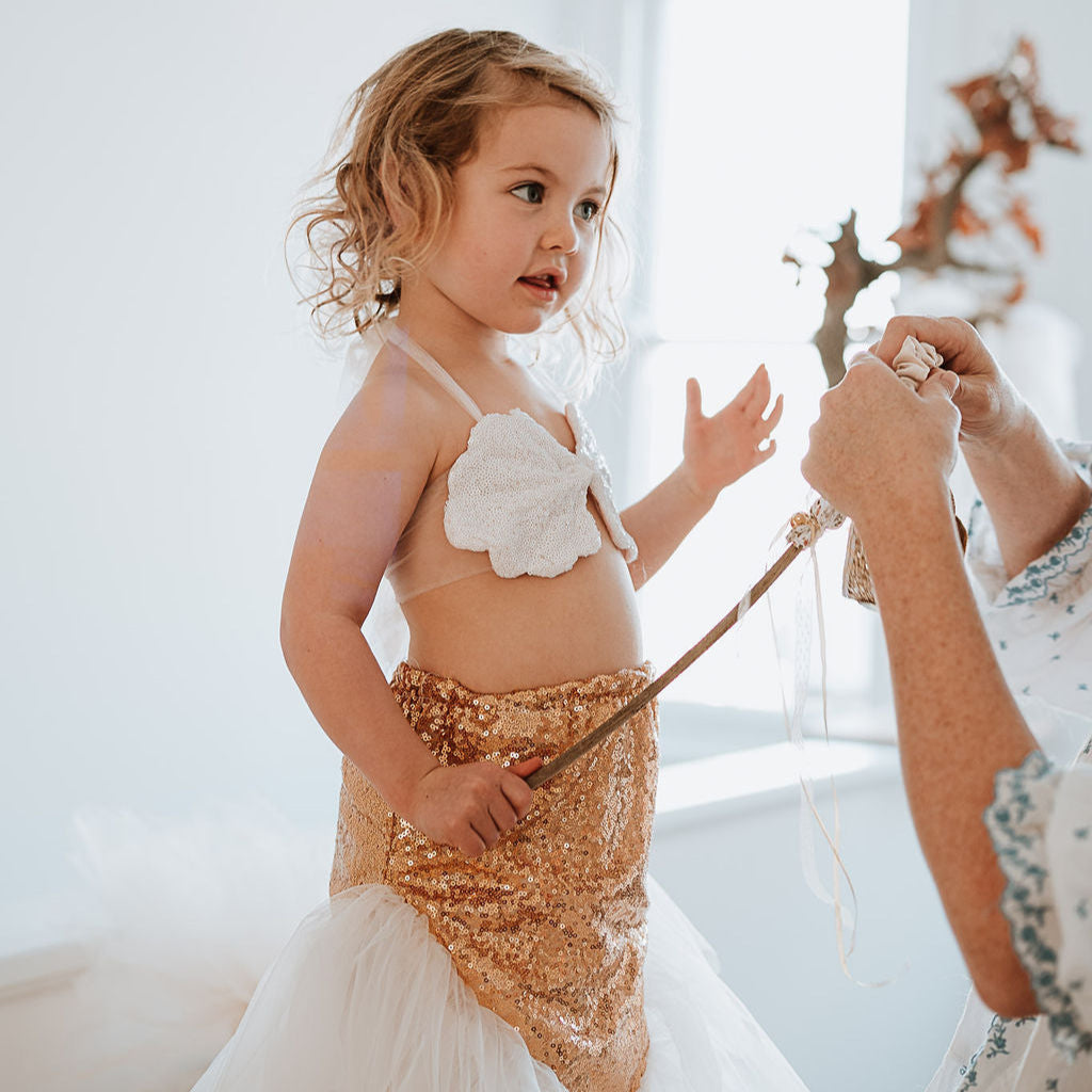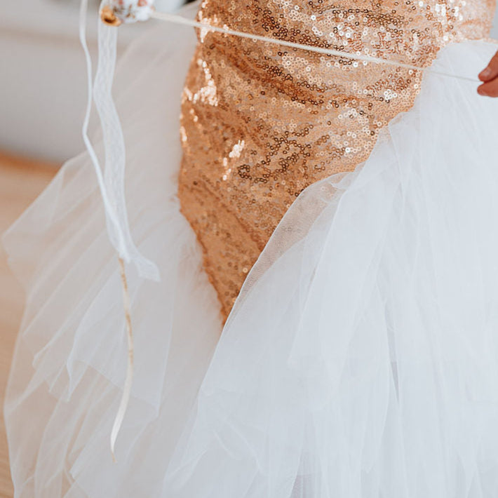 cotton lined sequin skirt and top with soft tulle frills this outfit wont be scratchy on your little ones sensitive skin.