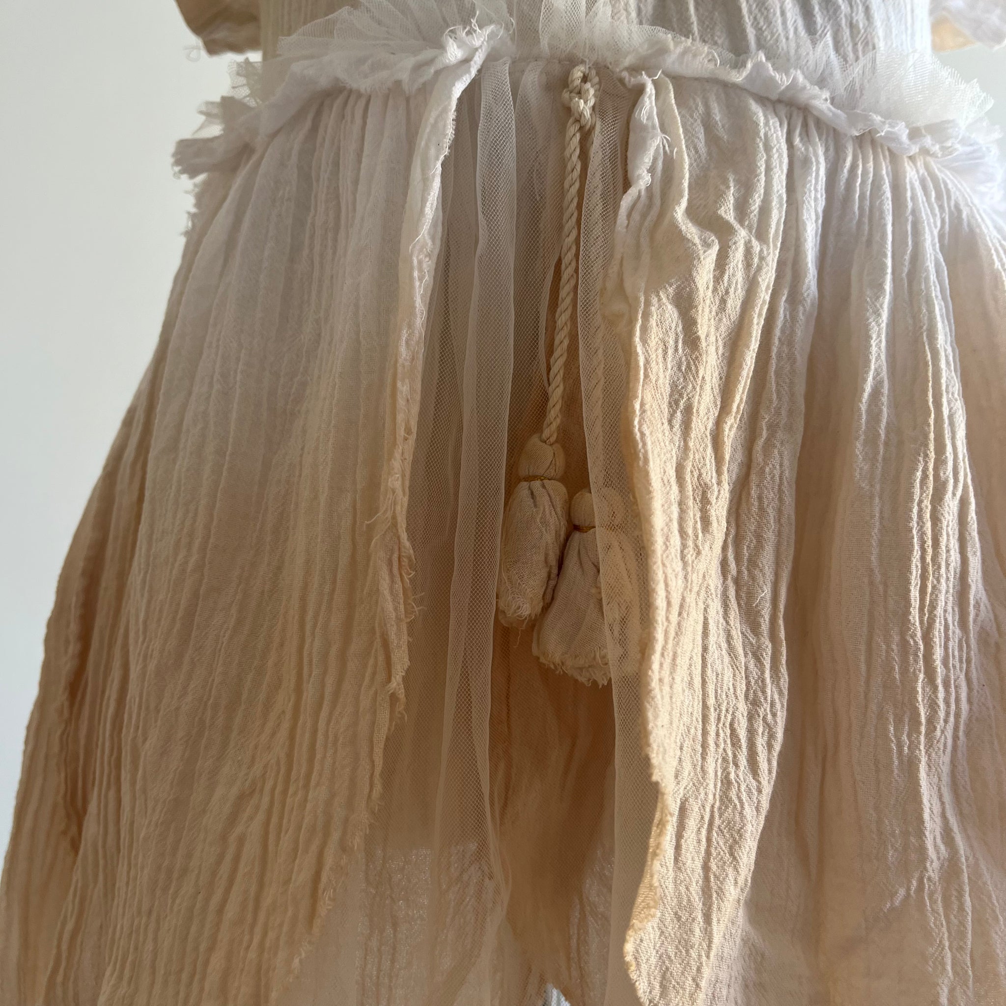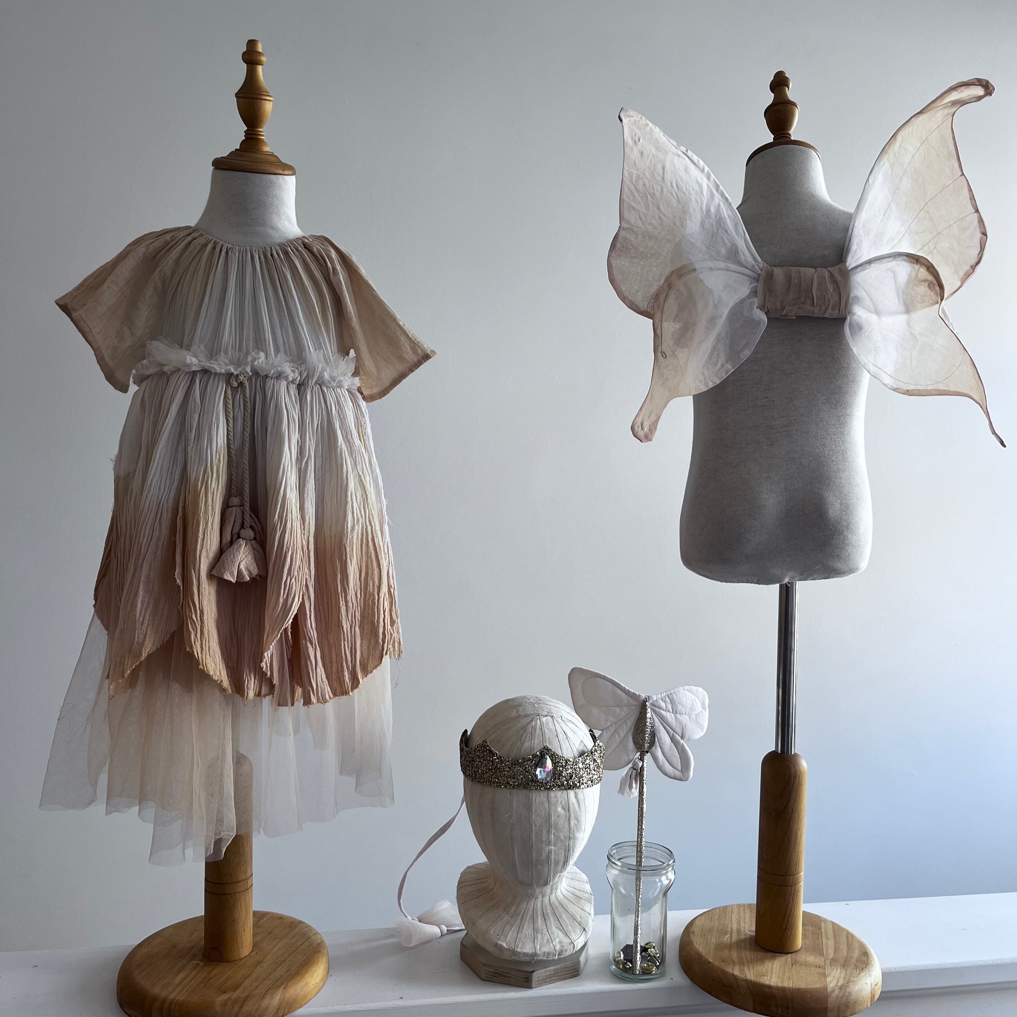 this whimsical fairy dress is layers of soft tulle and 100% cotton petals dipped in natural dyes .